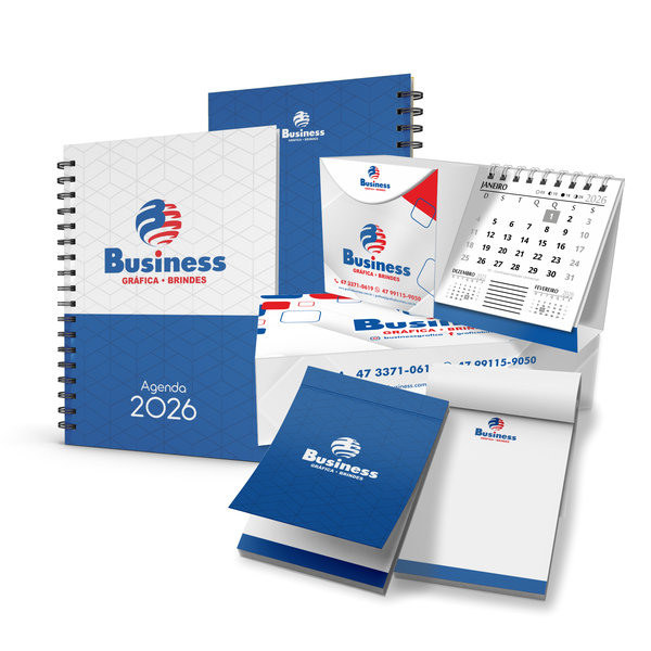 O Kit Corporativo Premium da Gráfica Business é a solução completa para brindes empresariais elegantes e funcionais. Reúne três itens indispensáveis para o ambiente profissional: uma Agenda Comercial 18x25cm com miolo personalizado e wire-o preto, um Calendário de Mesa Premium com arte padrão e um Bloco de Rascunho Premium. Ideal para empresas que desejam fortalecer sua marca com produtos de alta qualidade e excelente apresentação.