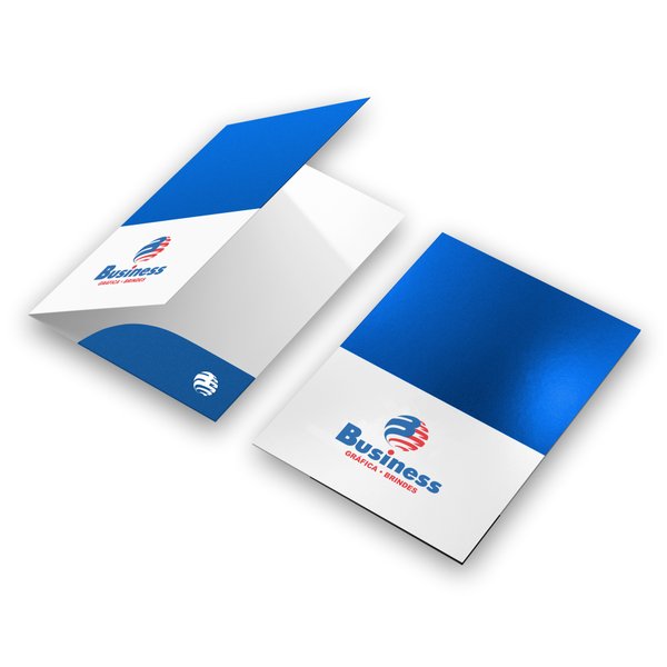 A Pasta Gráfica Business no formato 315x460mm é produzida em papel couchê fosco 300g com impressão 4x0 cores na parte externa. Conta com bolsa interna colada e impressa, oferecendo um visual completo e funcionalidade extra.